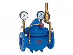 当主阀进出口间压差变化时,接管A与接管B间压差发生变化,此压差通过接管作用于导阀膜片两侧,改变导阀的开度。压差大时导阀开度大,控制室通过C管的下泄水量增大,主阀控制室压压力下降,主阀开度增大,主阀进出口间压差变小。反之,若主阀进出口间压差变小,则导阀开度变小,主阀控制室压力上升,推动主阀开度减小而使主阀压差增大。这种负反馈作用使主阀进出口间压差稳定在设定值上。